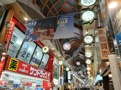 アーケードの天井には綺麗なイルミネーションが飾られ、華やかな雰囲気となっております。